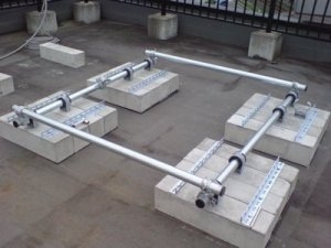 コンクリートブロックをアングルで連結し、専用インシュレーター・ホルダーで固定します。これにより振動なども吸収し、屋上でも騒音などを気にする事なく設置が可能です。
