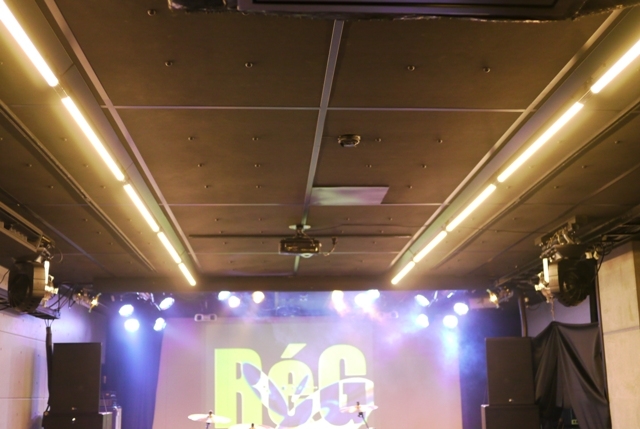 また、テナントビルなど、限られた電力容量の中でシステムを設計する上で、従来のハロゲンランプとディマーユニットを用いたシステムでは、大きな制約がつきました。RGBミックスが行えるPARライトは、高輝度タイプのものでも、消費電力が50W前後でおさまるため、特別な電源配線や回路設計は必要なく、通常の電源コンセントで対応することができます。
